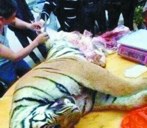Something I recall having seen on Xinhua (新华网) last year (2014) was a report of tigers being butchered on the street in the southern Chinese province of Guangdong, in a town called Leizhou (雷州市). The pictures you can find if you search 雷州市宰杀老虎 (Leizhou City slaughter tigers) are particularly shocking, with the corpses of tigers being drained, before being stripped of their hide and meat. Tiger bones, organs and genitals are also used in Chinese medicine, so every part of the animal has a monetary value on the black market – and it is the black market, as tiger parts are illegal in China, which is a signatory of CITES. But as with many things in the country, it’s only illegal if it’s enforced, and to see any animal – let alone a tiger – being butchered in the street so openly is extremely disturbing.